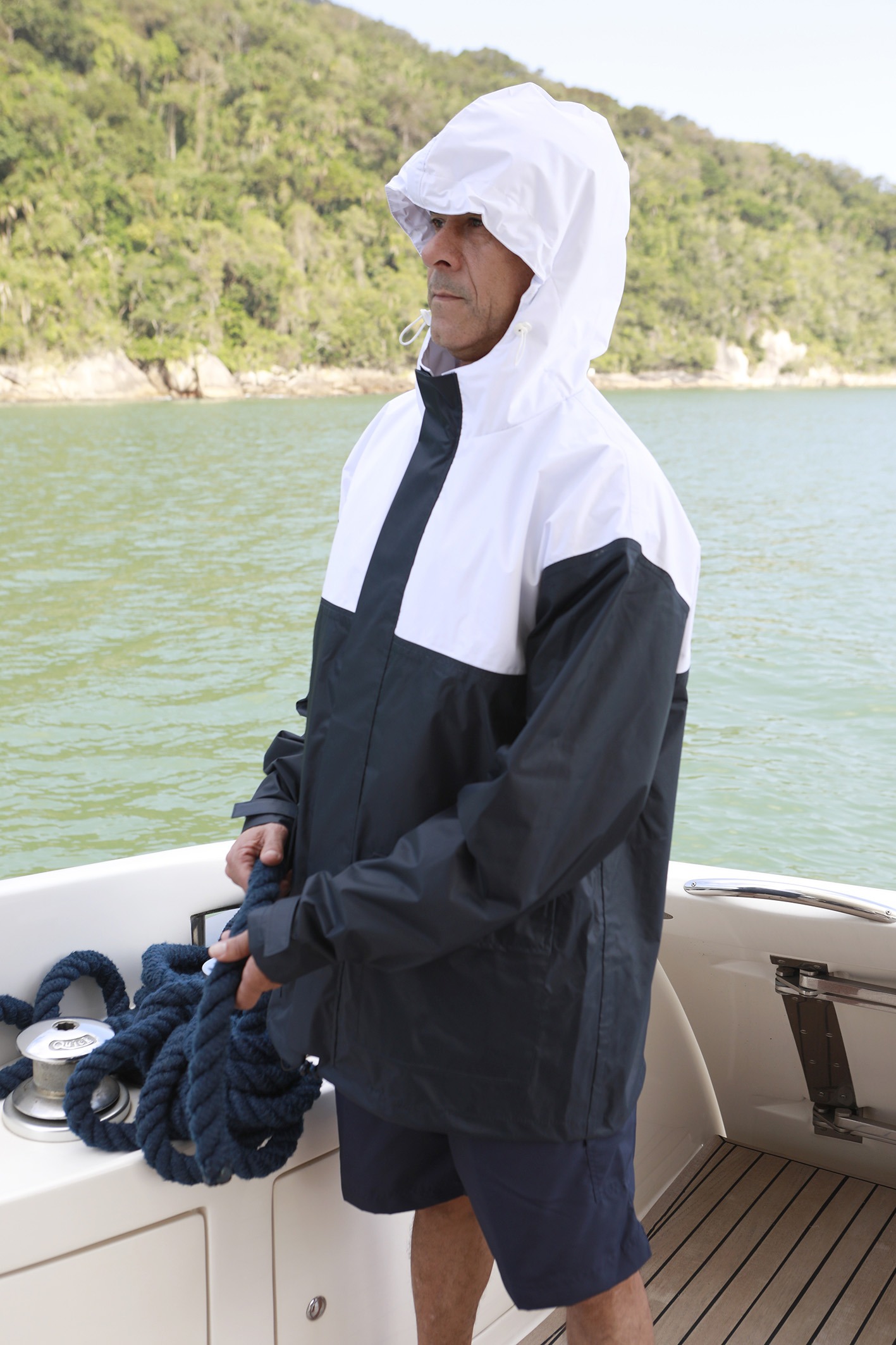 Capa de Chuva com Capuz em Nylom Emborrachado, possue zíper destacável na frente, elástico com reguladores na barra e no capuz, forro impermeável, velcro nas mangas para facilitar regulagem. A capa é toda selada internamente vedando as costuras, oferecendo maior proteção contra vento e água. Ideal para uso à bordo.