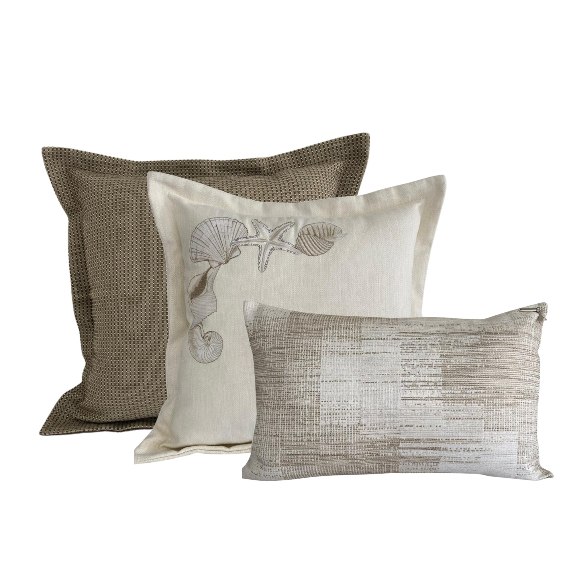 1 Almofada 50×50 com aba tecido O’Alcapan Alabaster bordado conchas.