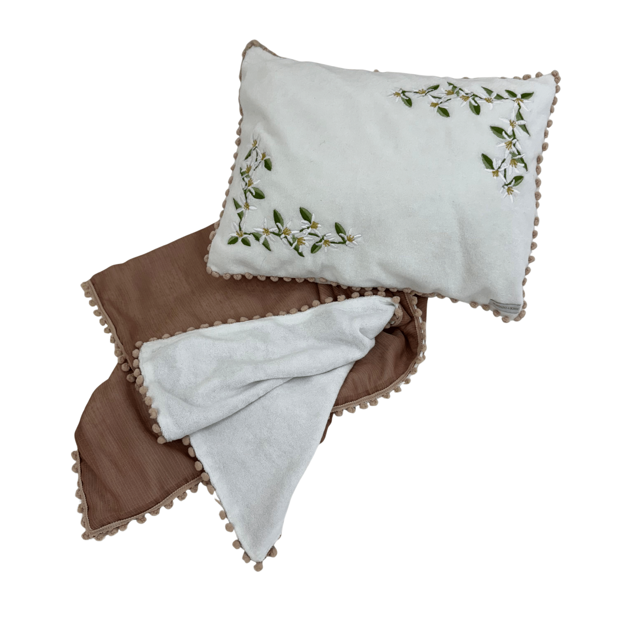 A almofadinha vem com pompons na borda para dar um requinte a peça, seu tamanho é de 30X 40 e a Canga de 1,46cm X 1,06cm!!