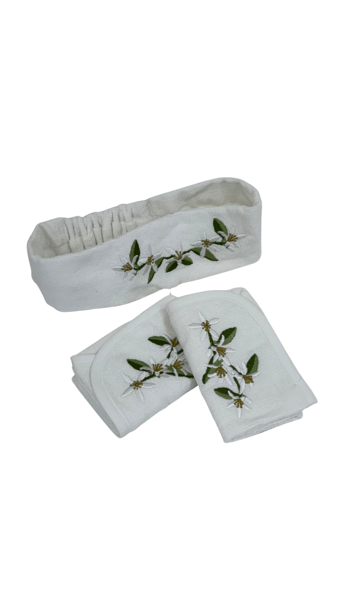 Kit Makeup 1 Faixa de Cabelo 2 Toalhinhas Bordadas Linha Flor de Laranjeira, para uso no skincare, fabricada com felpa aveludada delicada e macia, para secar a pele do rosto sem agredir.