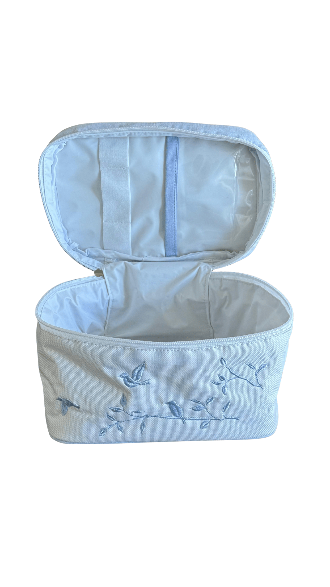 Necessaire Frasqueira em Nylom branco, com detalhes azul e bordado Cotton & Linen.