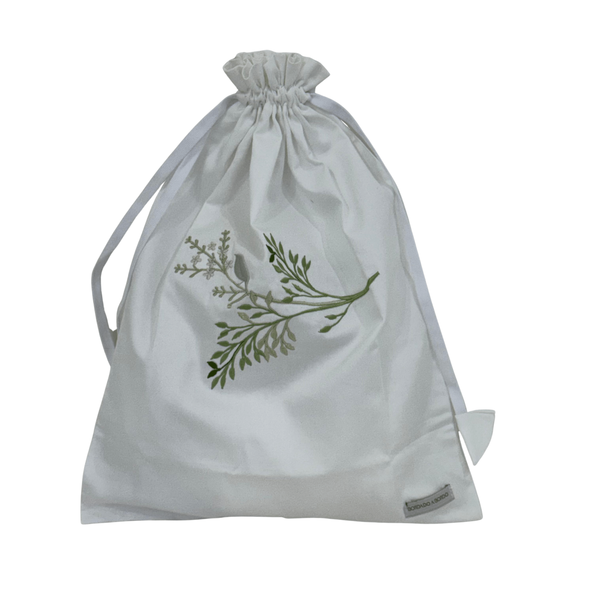 Saco multi-uso em Percal 400f branco, medindo 28X34cm, com cadarço em poliéster branco, bordado exclusivo Linha Verbena, produzido pela Bordado a Bordo, para combinar com a linha de Aromas da Greenswet.